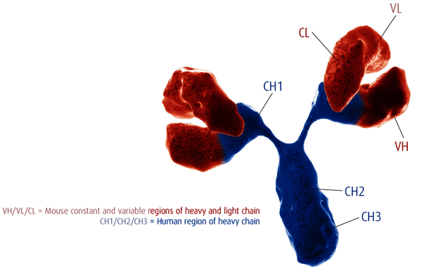 SERION antibodies are produced in transgenic mice by replacing the mouse sequence of the heavy chain constant region (IgM locus) with the corresponding human sequence. After immunization with the antigen of interest, generated antibody clones are cultivated by standard hybridoma techniques. These consist of the human constant region of the heavy chain, mouse variable region of the heavy chain and mouse light chain. The human constant region of the heavy chain can be directly recognized by the anti-human conjugate, which is used in numerous in-vitro diagnostic assays. The production process is carried out in collaboration with with Bcell Design (Illkirch-Graffenstaden, France).